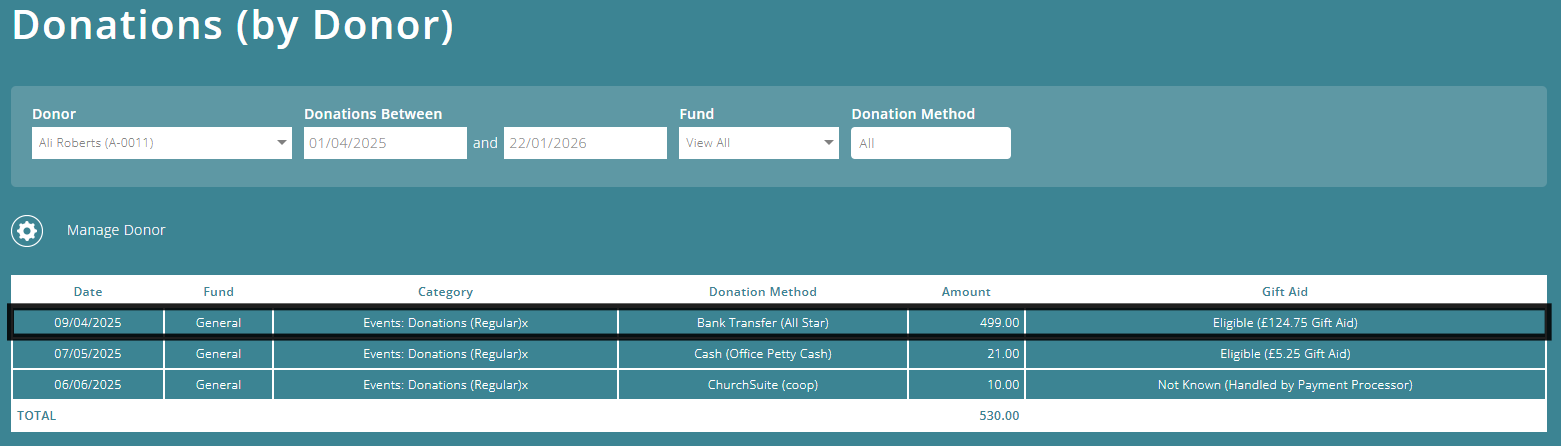 Then, once you've finished bank matching each month, you can simply go to the Manage Donor Screen, click on the donor whose donation needs splitting.