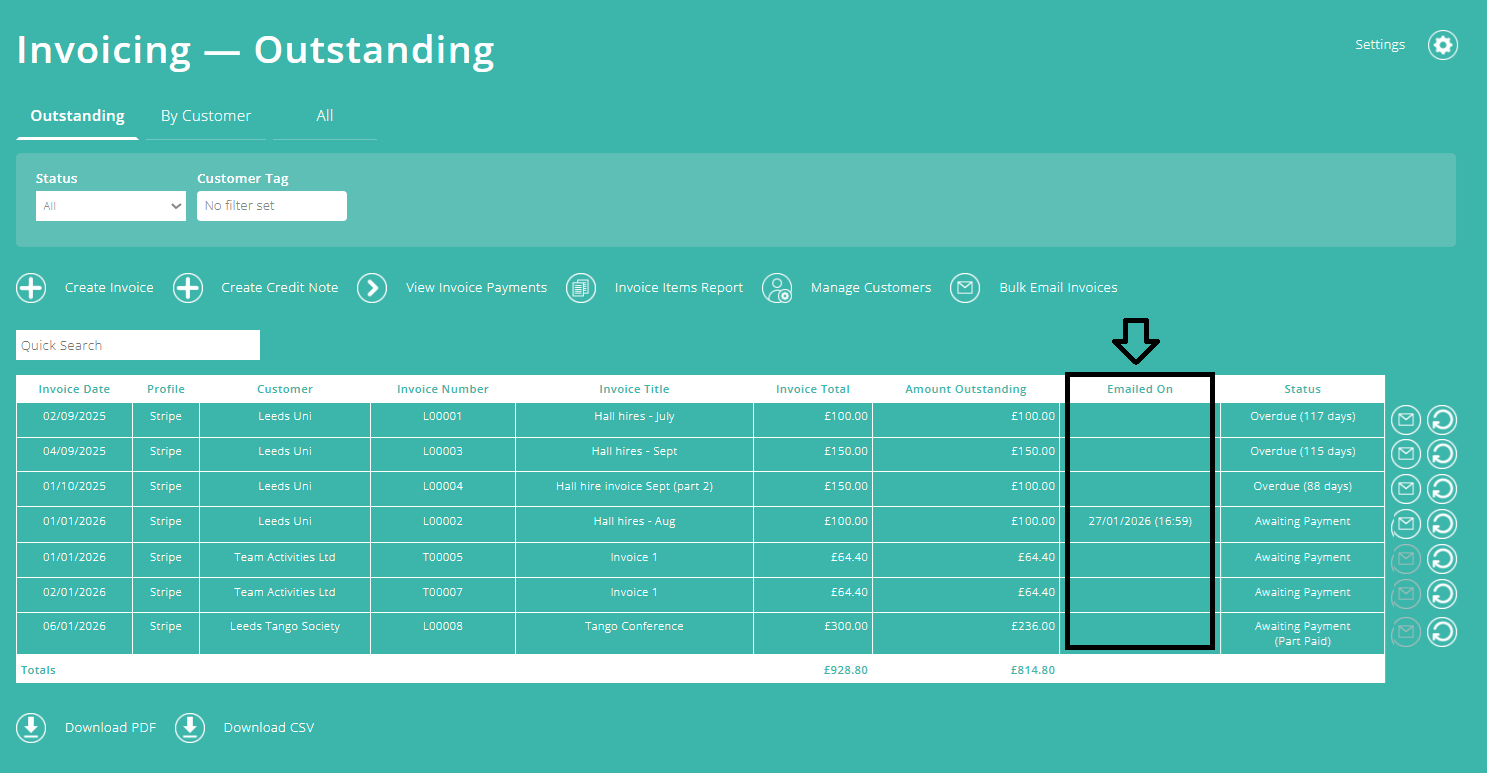 In the Invoicing screen, the column labelled 'Emailed On' lists the date and time an invoice was sent out. If there is no date and time listed, the invoice was created but hasn't been emailed to the customer.
