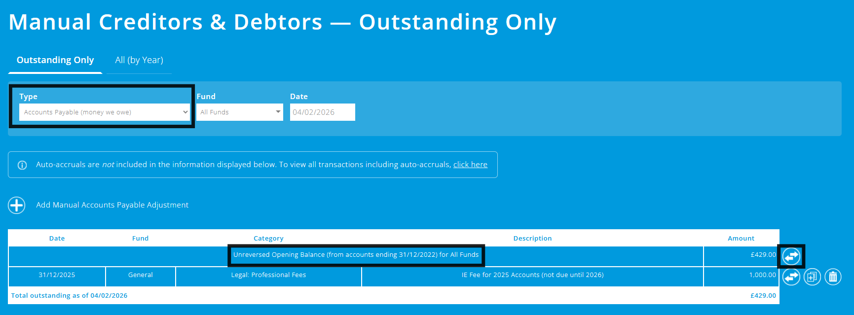 When a transaction is an opening accounts payable balance reversal, select this option from the dropdown list (see below). You will then be able to enter the fund it relates to; splitting the amount if needed against multiple funds.