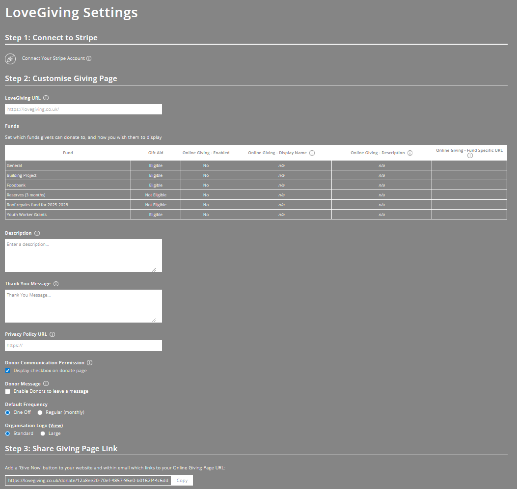 Step 2: Customise your Giving Page URL, add a logo, add a description of your organisation, select which funds users can give to, and further customise your Giving Page with features including: