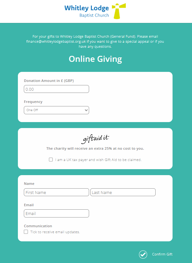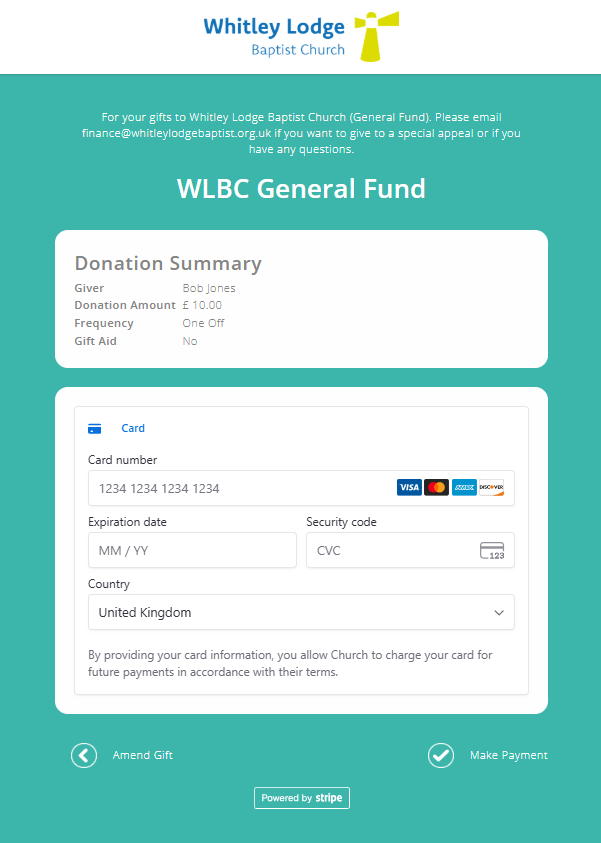 Once the donor has inserted their name, address (Gift Aid donors only) and email address, they need to click 'Confirm Gift' at the bottom of the screen, and they will be taken to a page enter their card details.