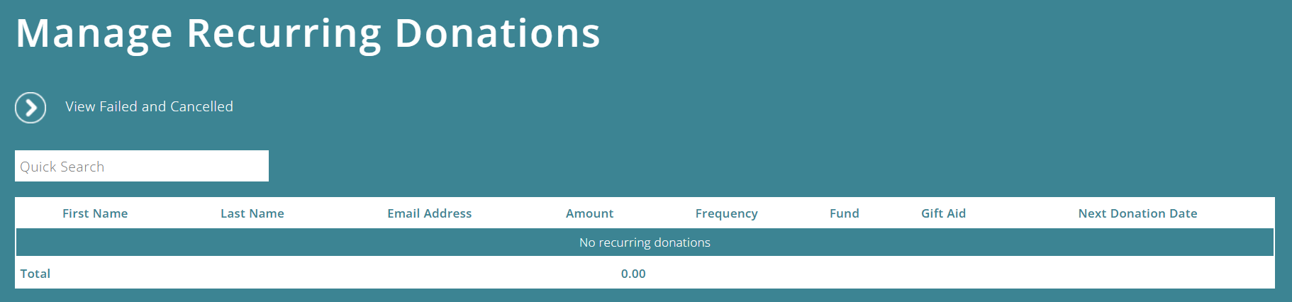 The Manage Recurring Donations screen will display any recurring donations currently set up.