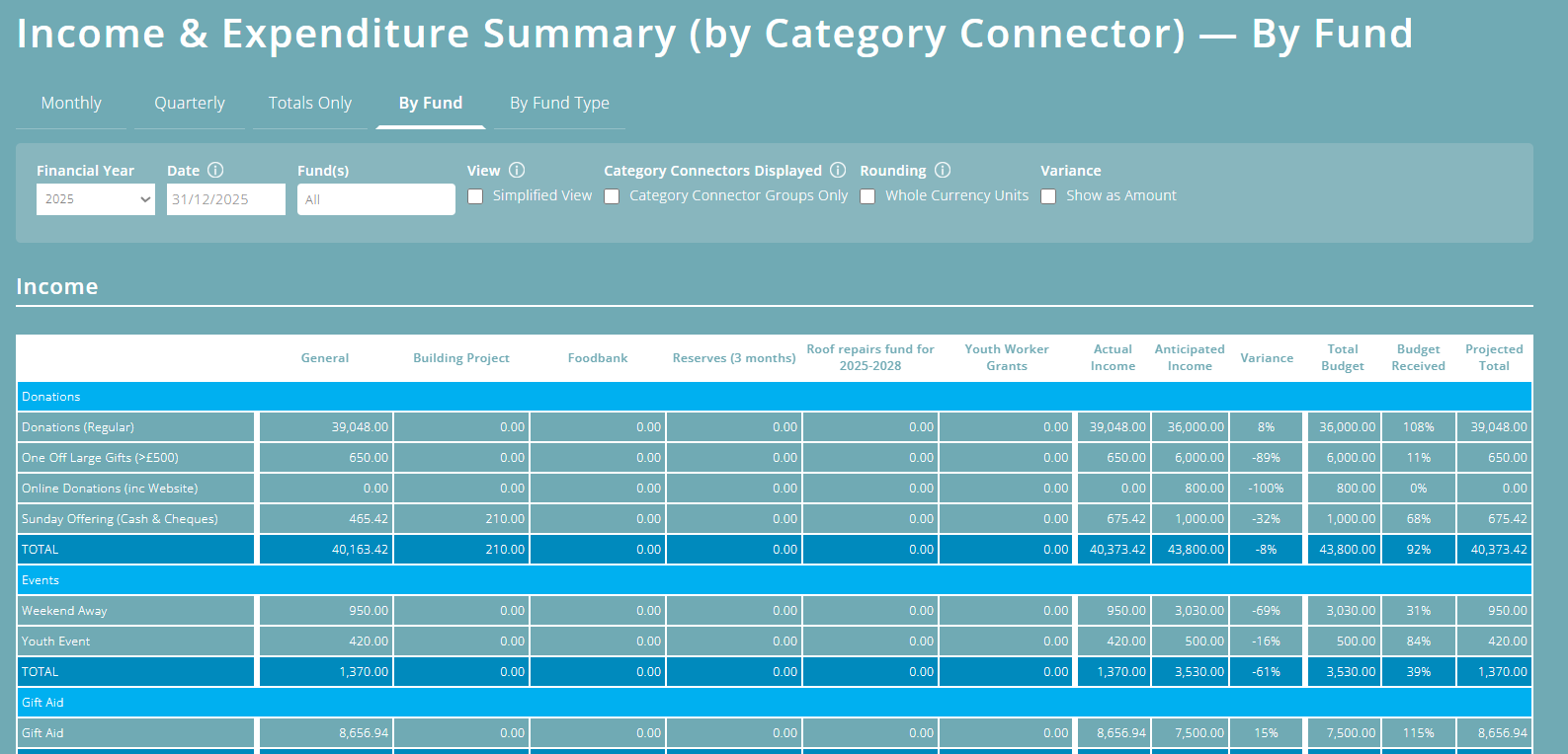 One of these is the 'By Fund' view. This shows a breakdown of income and expenditure across each category connector by fund, and provides a brilliant income and expenditure report across all funds