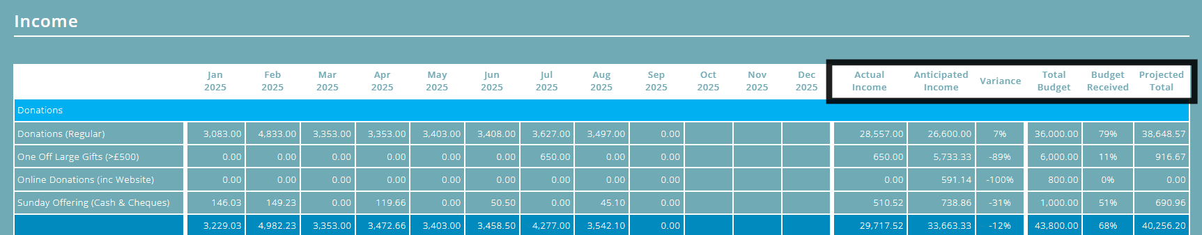 - Projected Total - this is forecast for your end-of-year income/expenditure totals based on your budgeted income/expenditure, your actual year-to-date income/expenditure and your projection settings. Find out more in this article: How are projected totals calculated?