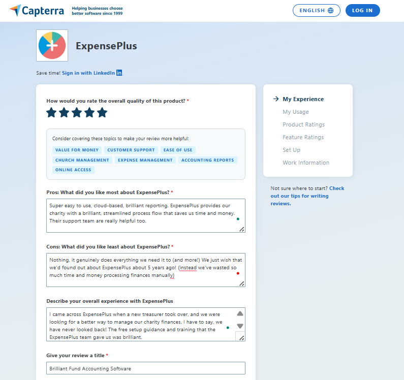 Thanks so much for considering writing us a short review. Capterra is a software comparison platform that is widely used by churches and charities looking for new fund accounting software.
