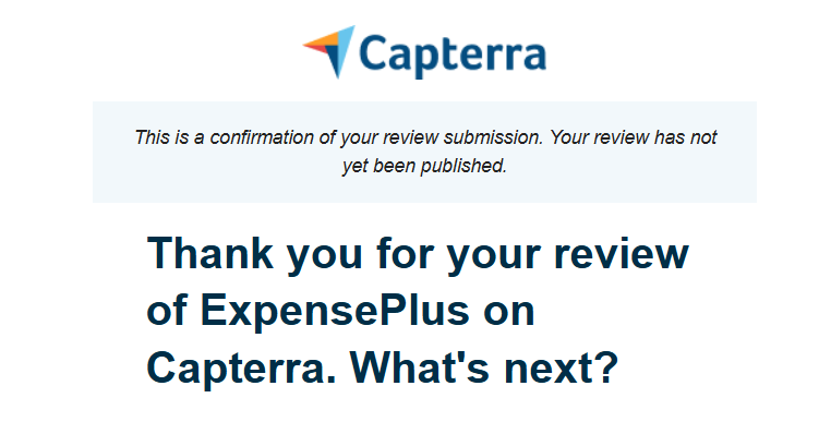 Once you've submitted your review, please you forward the confirmation email from Capterra (see below) to support@expenseplus.co.uk and let us know your address, so that we will post you a Limited Edition ExpensePlus Mug!