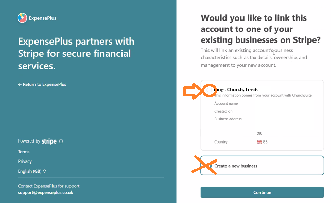 IMPORTANT: Even though you select the Stripe account you wish to connect to...during the process flow, Stripe will default to creating a new buisness. Be sure to select the radial button for your existing Stripe account, NOT the create a new buisness option!! (as shown in the screenshot below)