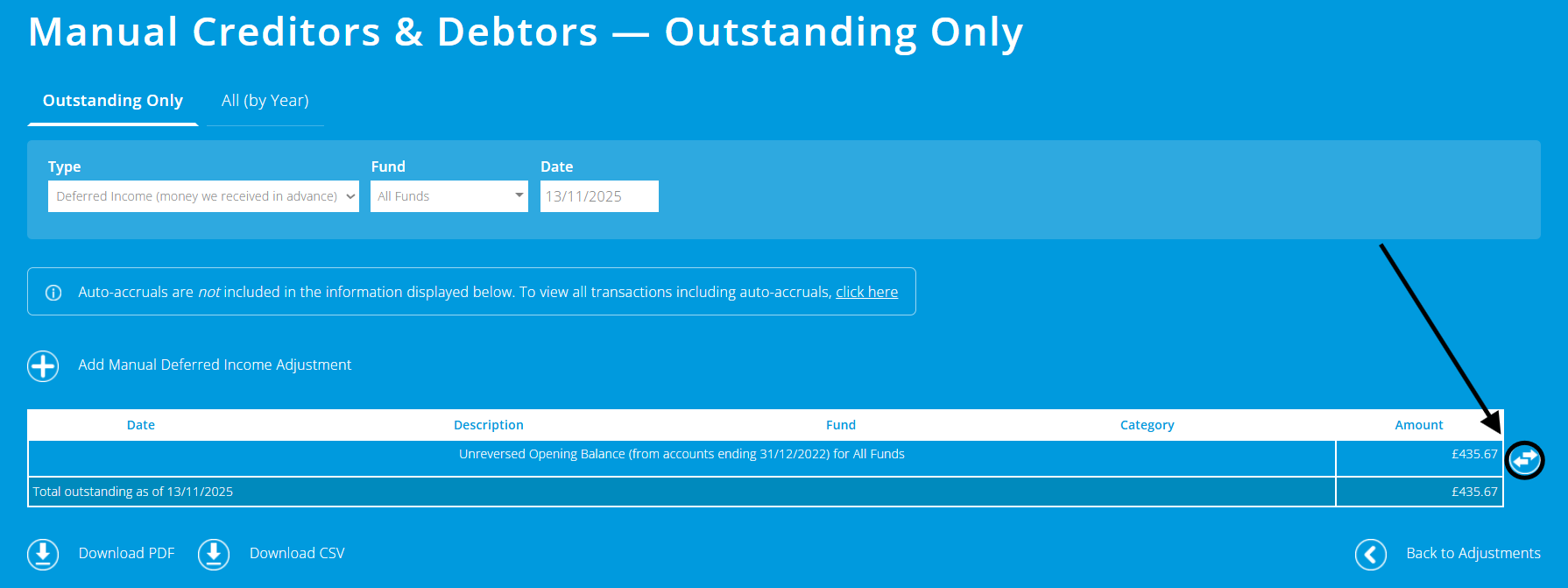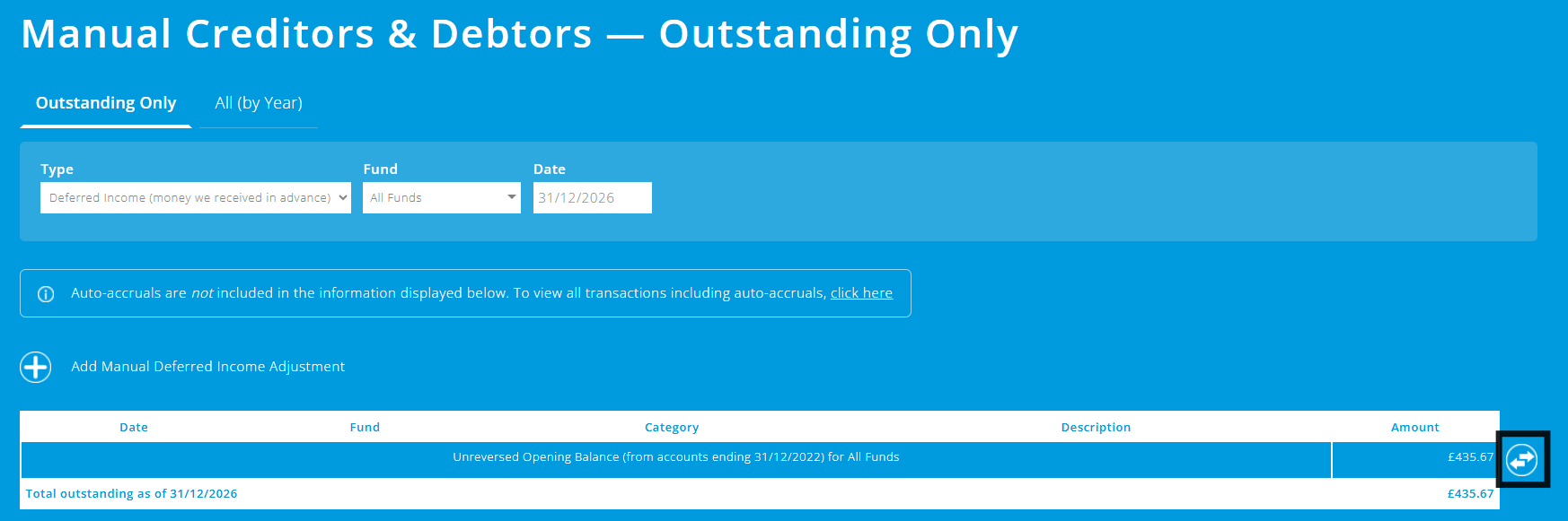 Note: it's important that your opening deferred income is reversed against the funds they were allocated to in your opening balance (which is why we recommend doing this process 'per fund'). If not, your unreversed opening balance for all funds may well be zero, but not zero for each individual fund.