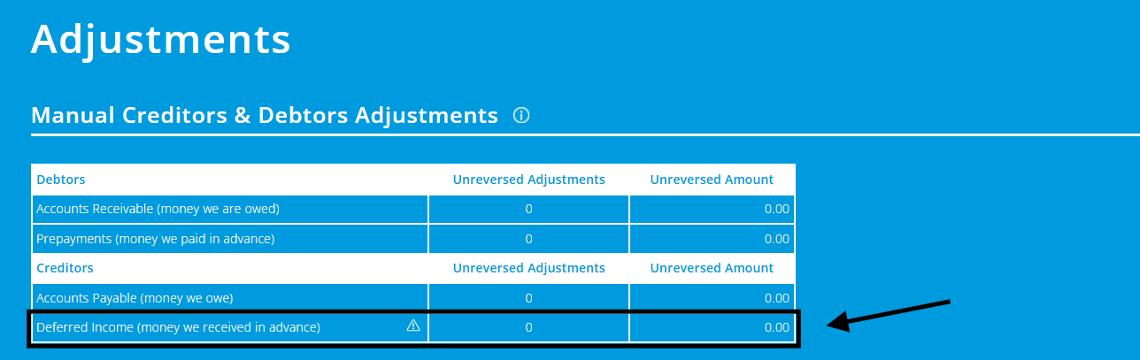 Within the Adjustment screen, in the 'Manual Creditors & Debtors Adjustments' section, click on 'Deferred Income':
