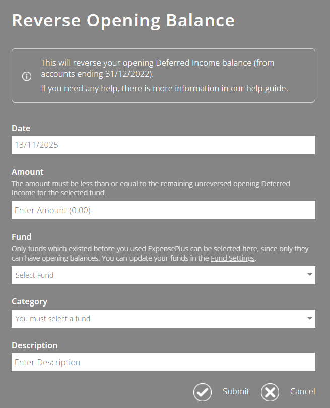 When setting up ExpensePlus, you will need to set up your opening fund balances. As part of one of these steps, you will be asked to allocate your opening deferred income balance to the different funds this relates to.