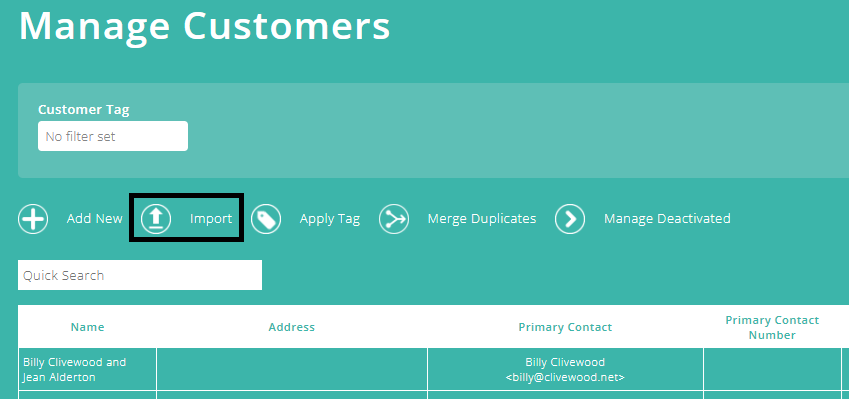 If you have multiple customers to add, you have the option to import their details. To do this, click 'Import' within the 'Manage Customers' screen.